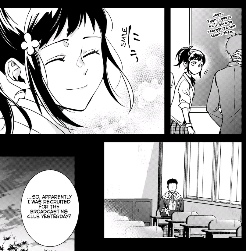 Then, she opened the door to the broadcasting studio near the back of the school, which the broadcasting club used as their clubroom. With her bright smile never leaving her face, she held open the door and turned to look back at me, as if inviting me to join her. Into her clubroom, into her daily club life.